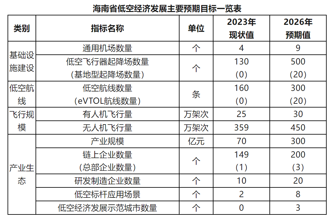 到2026年,出台3项政策制度;建设2个保障服务平台;建成通用机场9个,低空飞行器起降场超过500个;划设低空航线数量超300条;重点拓展建设8个低空应用场景;推动一批重点项目建设,实现全省低空经济总产值超过300亿元。